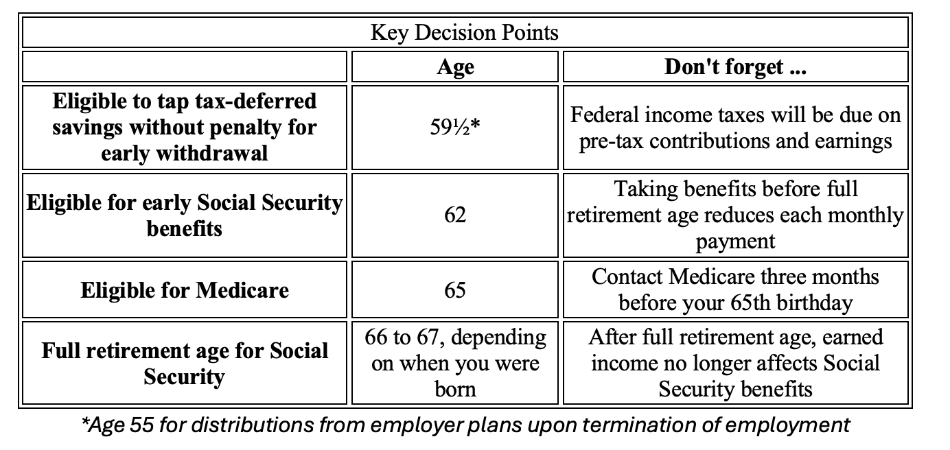 Deciding when to retire may not be one decision but a series of decisions and calculations. For example, you'll need to estimate not only your anticipated expenses but also what sources of retirement income you'll have and how long you'll need your retirement savings to last. You'll need to take into account your life expectancy and health as well as when you want to start receiving Social Security or pension benefits, and when you'll start to tap your retirement savings. Each of these factors may affect the others as part of an overall retirement income plan.