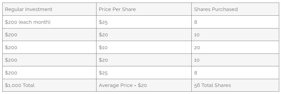 In this example, the average market price over the five-month purchasing period is $20 per share ($25 + $20 + $10 + $20 + $25 = $100 divided by 5 = $20). However, because the regular amount of the monthly investment buys more shares at the lower share prices, the average purchase price of actual shares purchased is $17.85 ($1,000 invested divided by 56 shares purchased = $17.85). Note: This example is for illustrative purposes only and does not represent any particular investment.