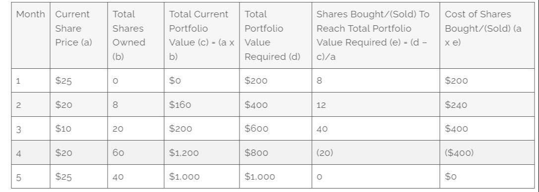In the example illustrated above, the dollar cost averaging strategy was to invest $200 per month. The value averaging strategy would instead seek to increase the portfolio’s total value by (for example) $200 per month. In months when the total portfolio value has declined, you’ll need to buy that many more shares to make up the difference. When the value of the portfolio increases, you’ll need to buy fewer (if any) shares to bring the total portfolio value to the desired level. In fact, if the share price increases sufficiently, you may need to sell shares to maintain your portfolio’s value at the desired target level.