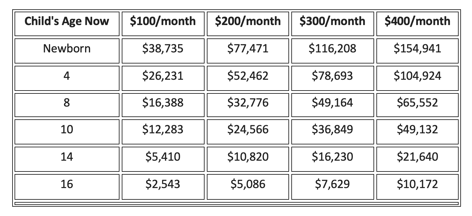 The chart shows how much money might be available for college when your child turns 18, if you save a certain amount each month.